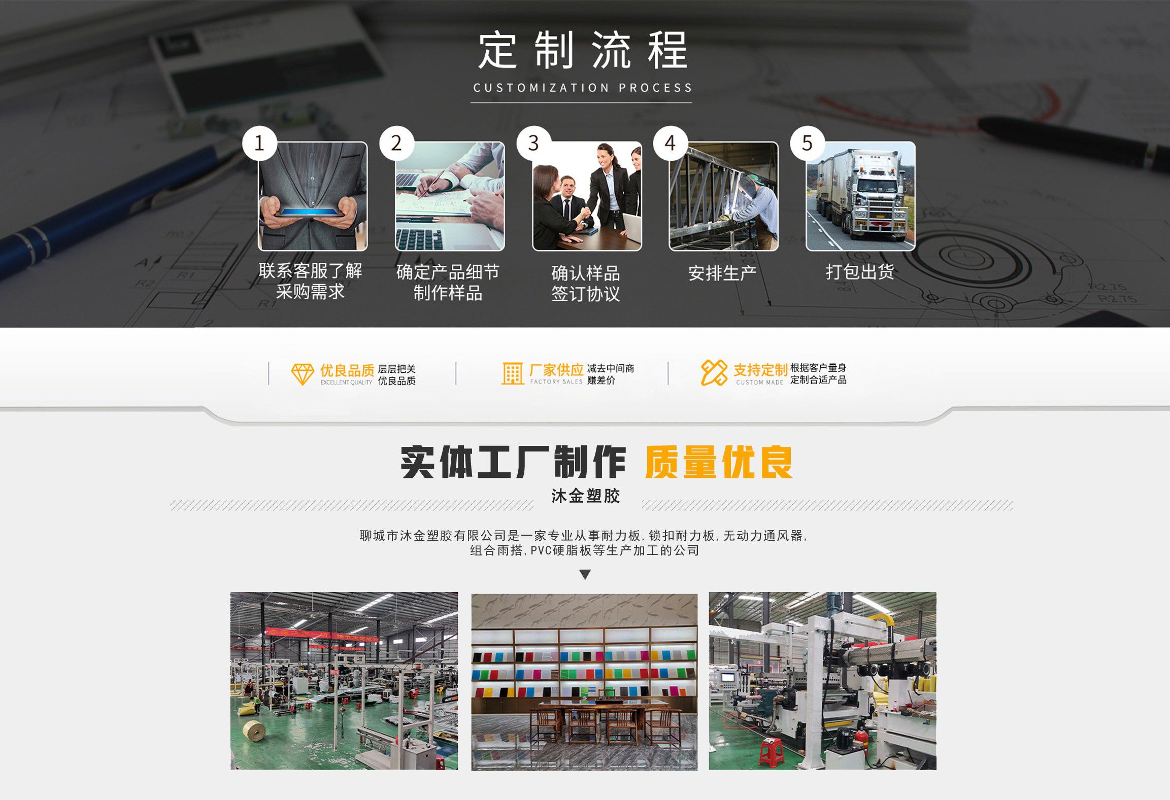 聊城市沐金塑膠有限公司注冊資金2180萬元,占地20000余平方,擁有自建廠房15000平方,員工100余名。10余年來,公司主營耐力板,鎖扣耐力板,耐力板深加工,無動力通風(fēng)器,組合雨搭,PVC硬脂板,耐力板廠家等板材的發(fā)展戰(zhàn)略,逐漸成長為綜合性企業(yè)?! 」緭碛卸鄺l板材共擠生產(chǎn)線,采用世界知名品牌進(jìn)口原材料和先進(jìn)工藝,依據(jù)完善的ISO9001質(zhì)量管理體系和ISO14001環(huán)境管理體系,為產(chǎn)品的卓越品質(zhì)提供了強有力的保證。憑借過硬的創(chuàng)新能力和堅實的硬件基礎(chǔ),贏創(chuàng)已成為國內(nèi)領(lǐng)先的熱塑性板材生產(chǎn)商,產(chǎn)品被廣泛應(yīng)用于建筑業(yè)、農(nóng)業(yè)、工業(yè)、廣告業(yè)、安防行業(yè)及DIY領(lǐng)域?! 」臼冀K致力于通過提供最優(yōu)的板材應(yīng)用解決方案,為客戶創(chuàng)造最高的價值;堅守創(chuàng)新、質(zhì)量、靈活、服務(wù)和速度的核心價值觀;堅持“完美的產(chǎn)品需要完美服務(wù)的支持”的經(jīng)營理念,努力實現(xiàn)成為世界領(lǐng)先的板材與解決方案供應(yīng)商的夢想?! ≡谖磥恚緦⒘⒆憧蛻粜枨?,不斷改變和完善現(xiàn)有產(chǎn)品,拓展產(chǎn)品線和充分開發(fā)板材的應(yīng)用領(lǐng)域,為客戶創(chuàng)造全方位的價值。同時更好地實現(xiàn)員工的價值,實現(xiàn)公司團(tuán)隊的價值。我們將與您一起創(chuàng)贏未來! 企業(yè)使命:成為世界領(lǐng)先的板材與解決方案供應(yīng)商。 公司愿景:通過提供最優(yōu)的板材應(yīng)用解決方案,為客戶創(chuàng)造最高的價值?! 『诵膬r值觀:質(zhì)量...